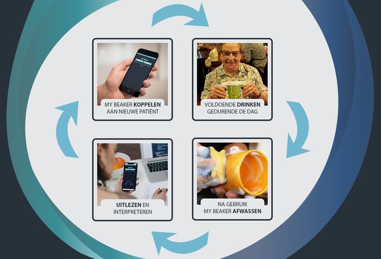 Na het instellen kan de patiënt drinken uit zijn eigen Beaker en middels de slimme fraude detectie bepaald My Beaker hoeveel opgedronken is.